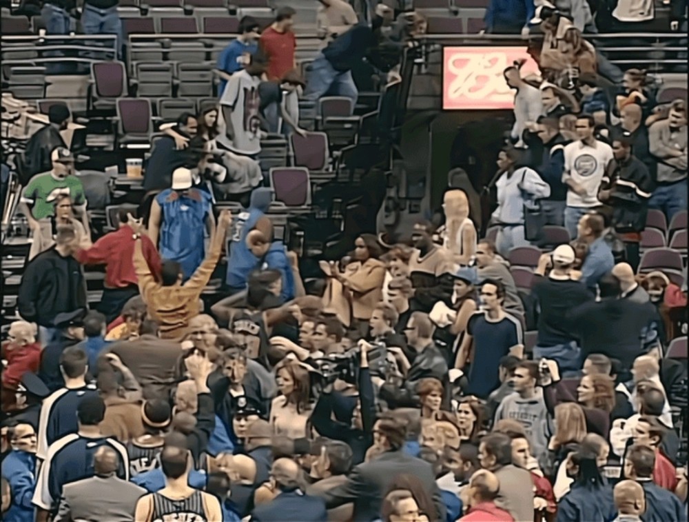 然而暴怒的阿泰其实找错了人,那个球迷并不是“凶手”。但是场面已经彻底失控,步行者球员史蒂芬•杰克逊,小奥尼尔也冲上看台跟球迷打成一片,几位职业篮球健将万军丛中左冲右突,以一敌十丝毫不落下风,只有费雷德•琼斯略显尴尬,被球迷打得抱头鼠窜。